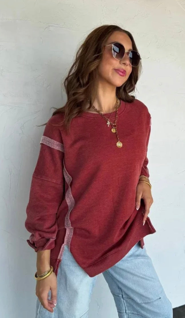 We spared no attention to detail in our new mineral washed sweatshirt! This forever timeless pullover is a slouchy, relaxed fit with exposed seaming, cute split cuff hem and ribbed trim detail! With a super soft sweatshirt feel on the inside